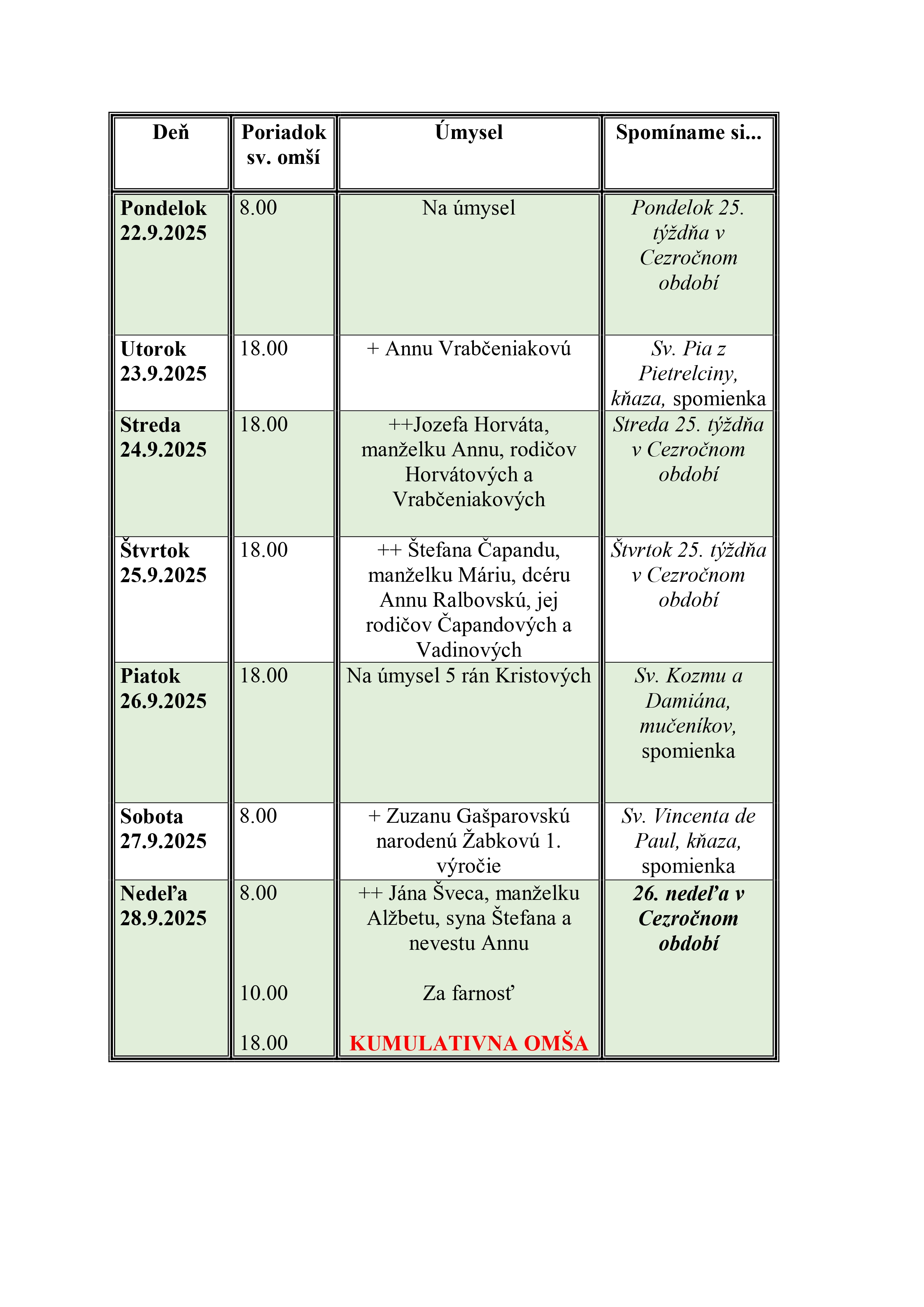 Raspored svetih misa (25. Nedelja kroz godinu u godini C)