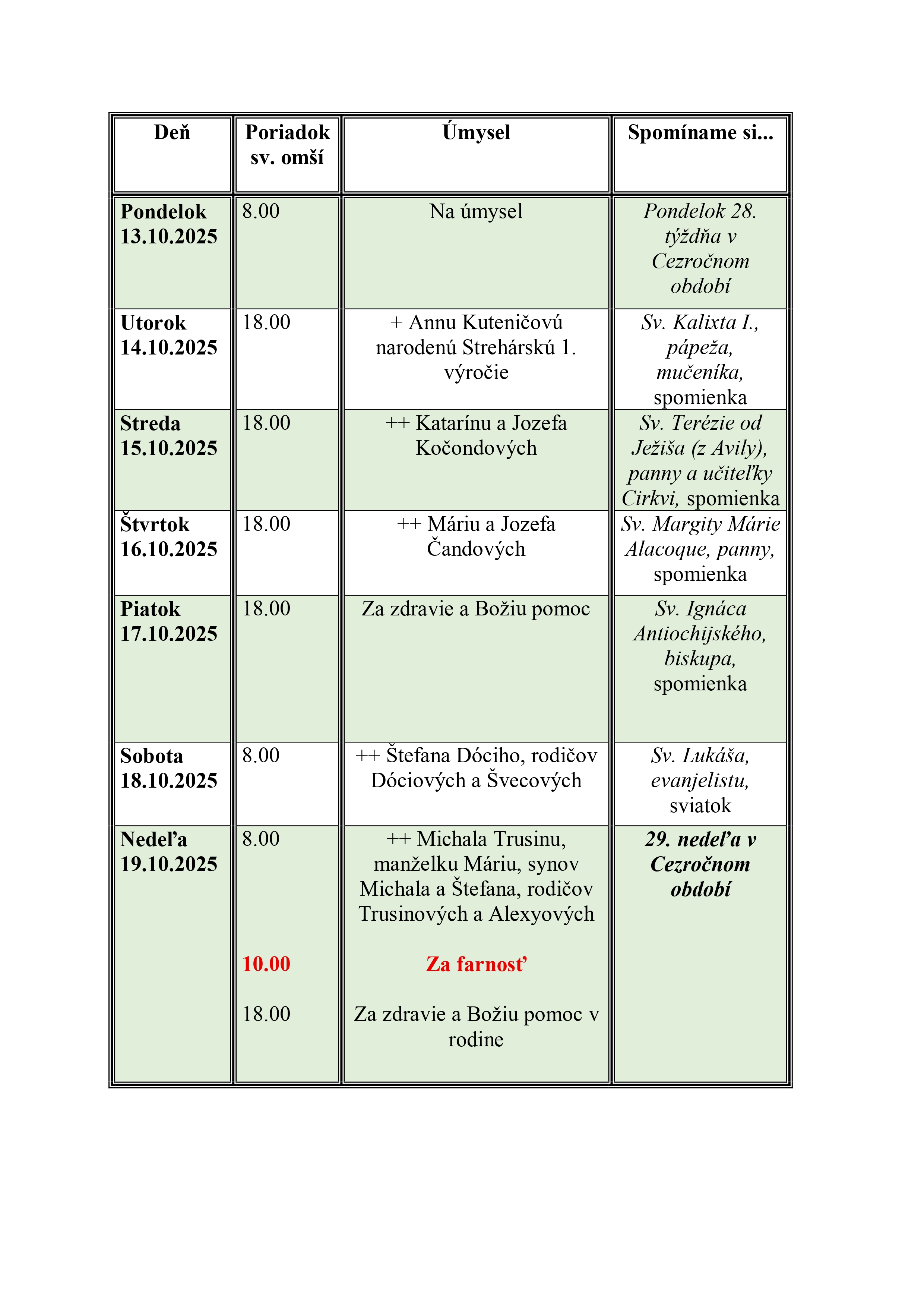 Raspored svetih misa (28. Nedelja kroz godinu u godini C)